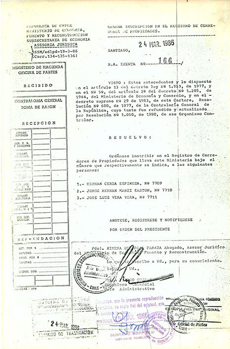 Para ser Oficialmente Corredor de Propiedades y/o Martillero Público ante el Gobierno de Chile, hay que cumplir ciertos requisitos, los cuales para ejercer legalmente se debe contar con la resolución del Ministerio de Economía, Fomento y Reconstrucción, donde se presentan documentos que acrediten estudios relacionados al rubro. Esto es exigido ante la entidad, para el nombramiento como Corredor de Propiedades y/o Martillero Público, y así se otorgue el numero de registro para ejercer legalmente estas actividades.